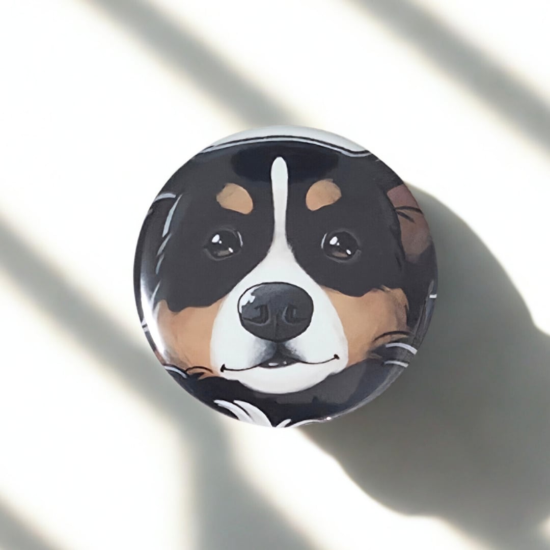 当店オリジナルの手描きイラストで、バーニーズマウンテンドッグの穏やかな表情をそのまま缶バッジにしました。